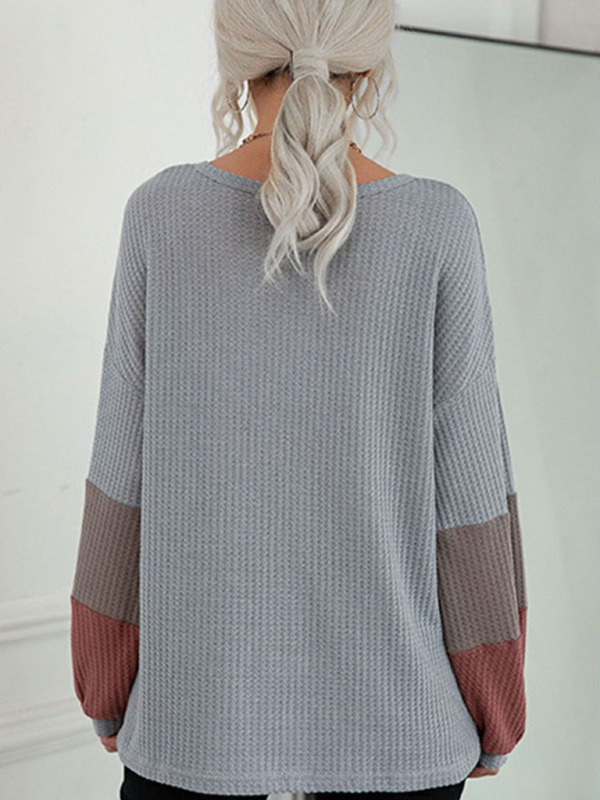 Autumn Colorblock Long Sleeve Grey V-Neck Knit Sweater