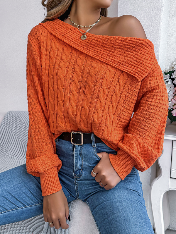 Casual Sexy Lapel Off-shoulder Cable Long Sleeve Pullover