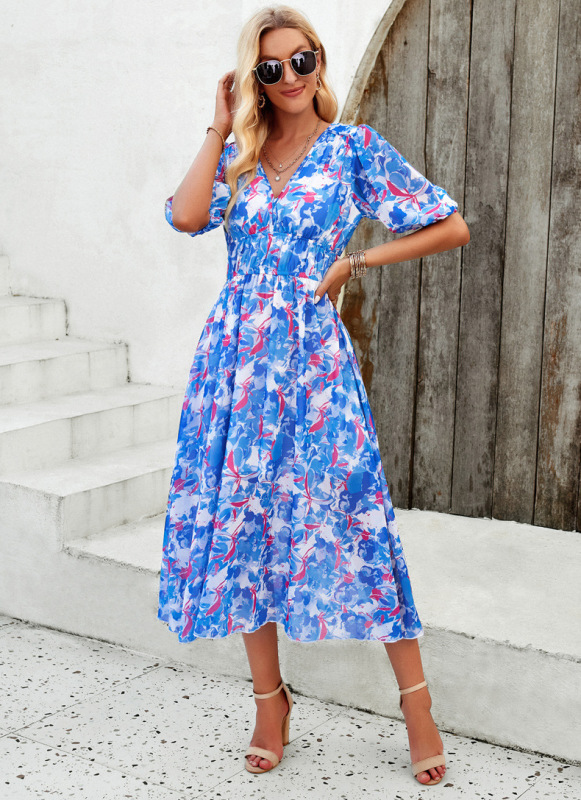 Elegant printed waist V-neck long dress