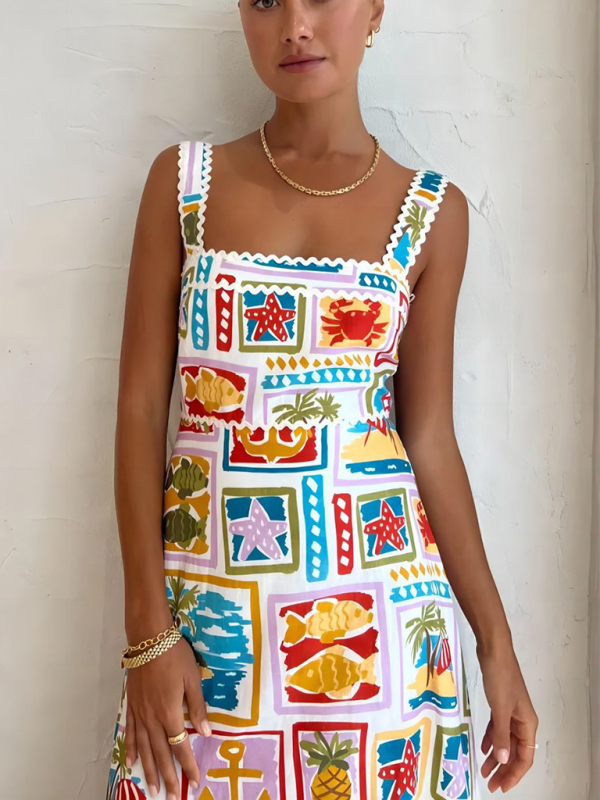 This dress features a suspender design that highlights women’s shoulder lines and collarbones, creating a sexy and charming effect. It may feature a graffiti print, which adds a personal and artistic touch. Lace decoration adds a romantic and feminine atmosphere to the dress.
