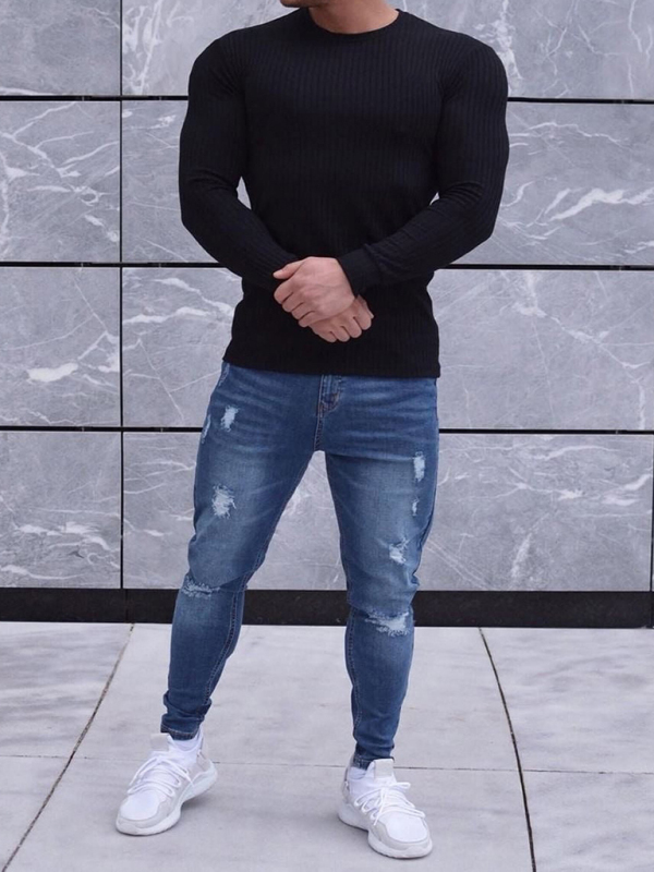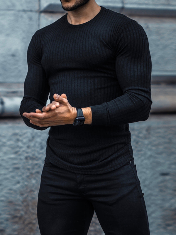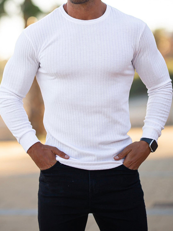 Fitness casual elastic vertical stripe round neck long-sleeved T-shirt