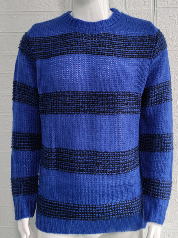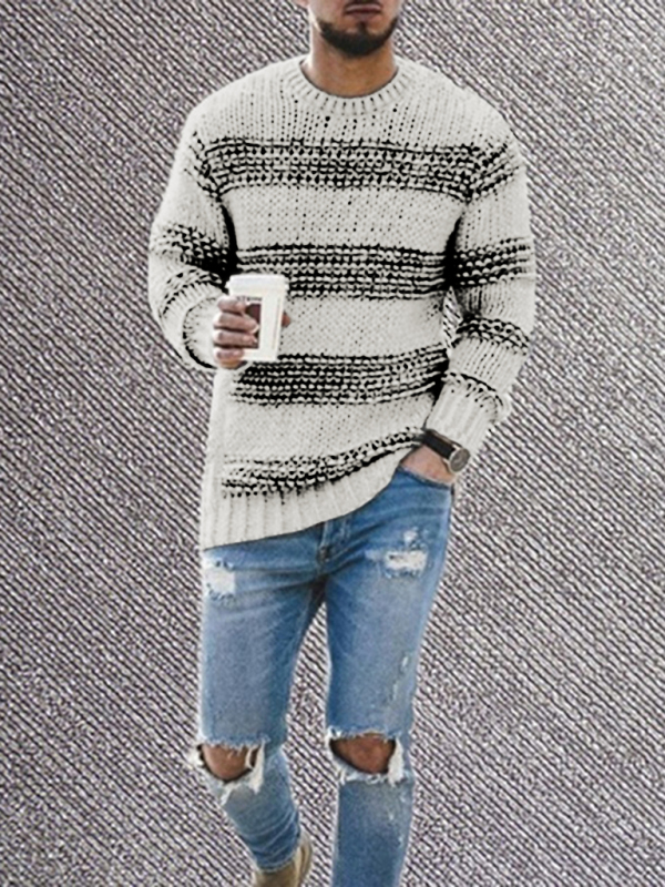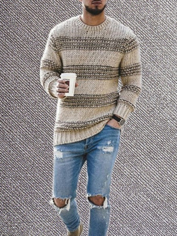 Men’s fitted striped round neck long sleeve knitted sweater. Please use the size guide shown in our pictures. Before choosing a size, please read each element of the size guide carefully. Unique design, classic style, casual and comfortable. It is suitable for outing and leisure. The size is measured manually, and the error of 1-3cm is normal.