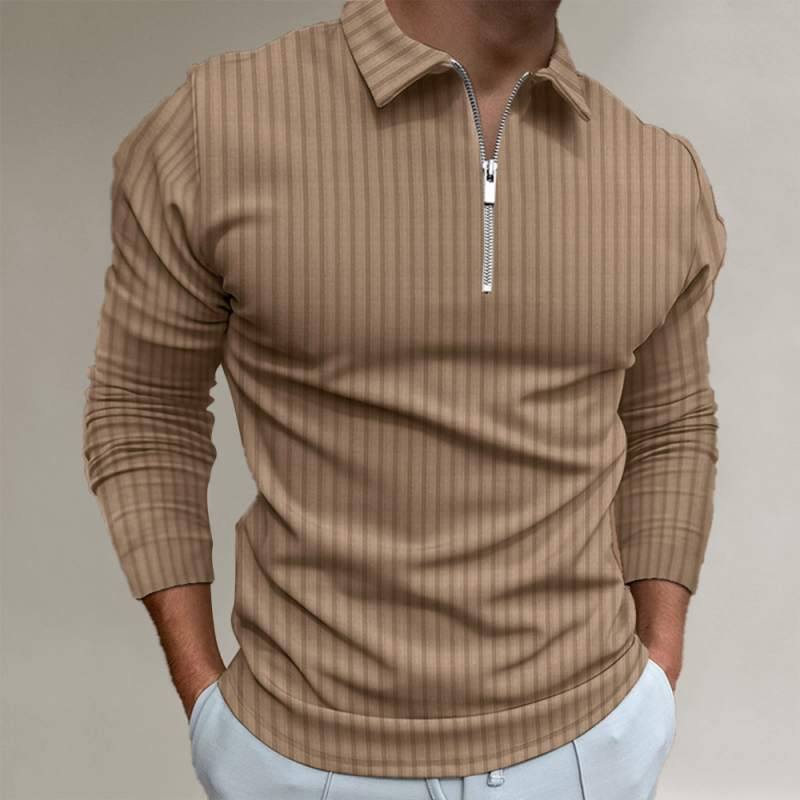 Men’s solid color zipper striped long-sleeved POLO shirt