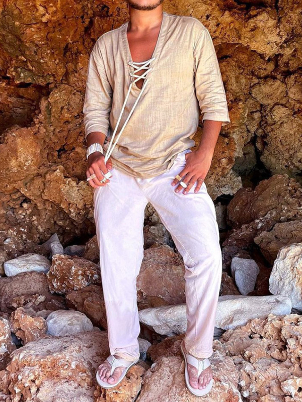 Men’s Woven Casual V-Neck Solid Color Three-quarter Sleeve Shirt