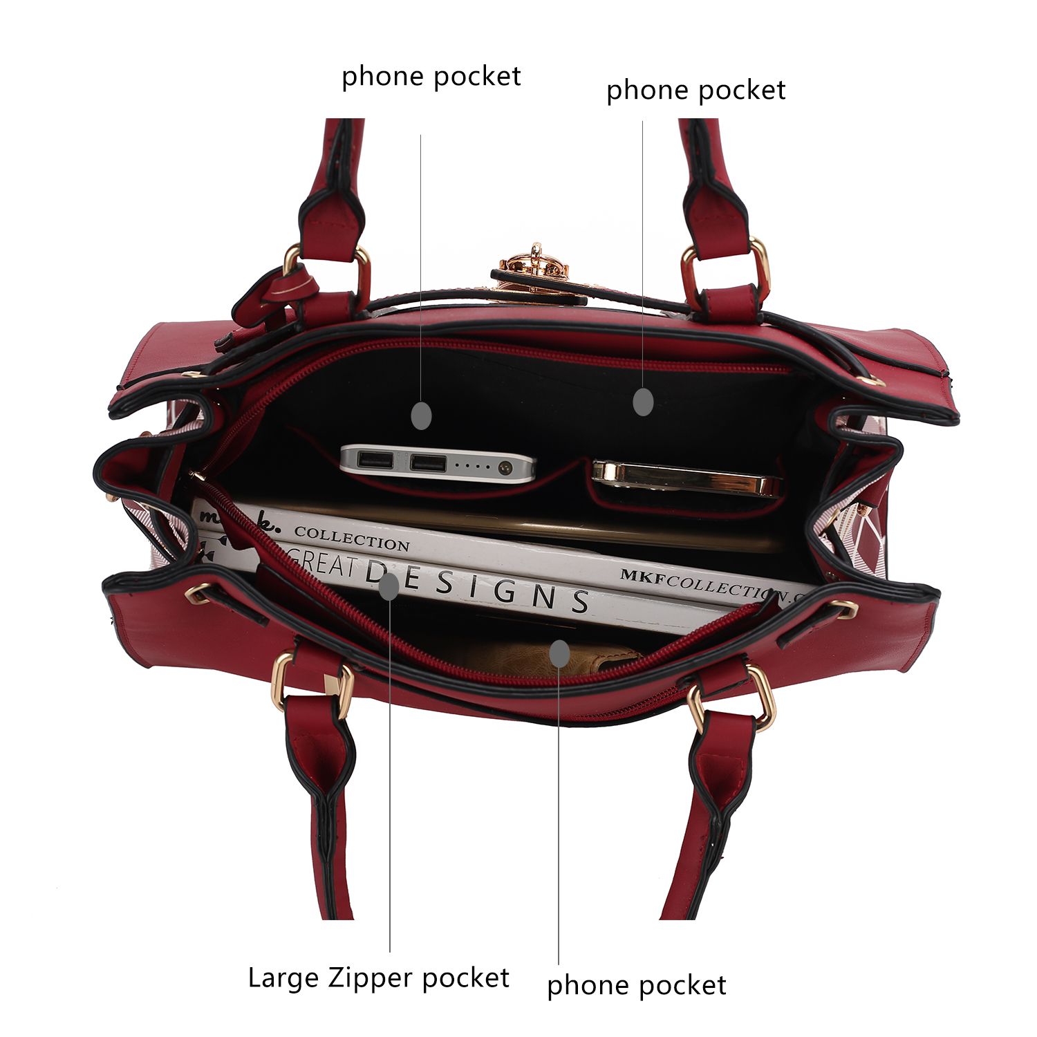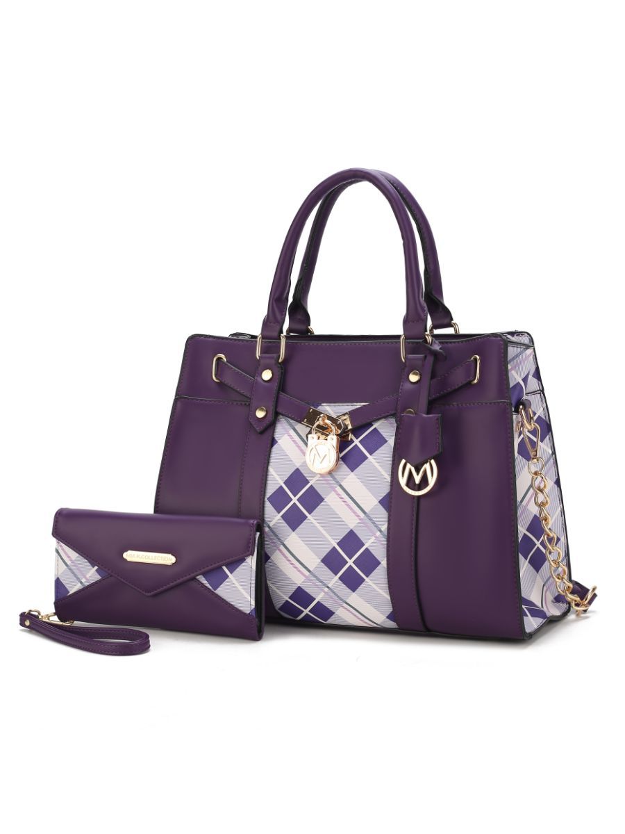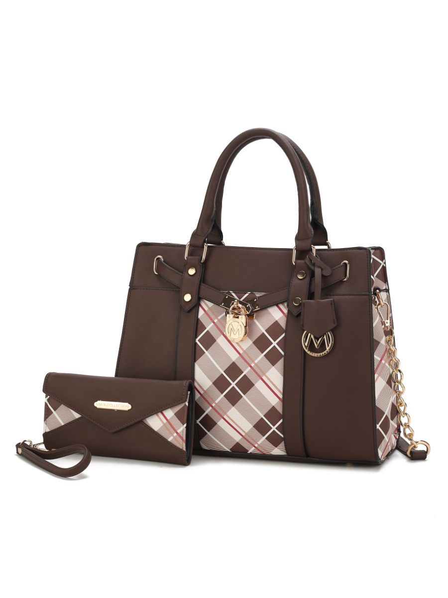 Our Christine Satchel Bag will top off any look with polished charm. Crafted from soft grainy high-quality vegan leather, it features adjustable side gussets and a turn-lock for decorative appeal. Unzips it to reveal a fully lined interior with a wall zippered pocket and two slip pockets. The exterior features a convenient back zippered pocket. Designed with gold-tone embellishments, this stylish purse comes with our M emblem attached for decorative purposes. Wear this style in your hand by the top handle or attach the shoulder chain-link strap to carry it as a crossbody for hands-free ease. This style has a flat base and feet for stability and comes with a matching envelope-inspired wristlet wallet.