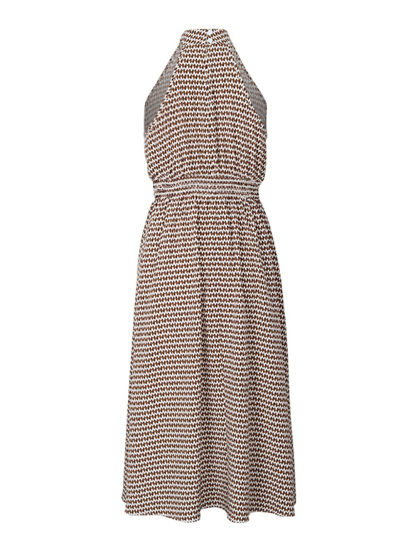 The dress adopts a halter neck design, showing off the shoulder lines and neck curves, adding female elegance and sexiness. The waist design is higher, highlighting the waistline and creating a body-modifying effect. The corrugated design makes the dress more layered and textured, adding visual richness and detail.