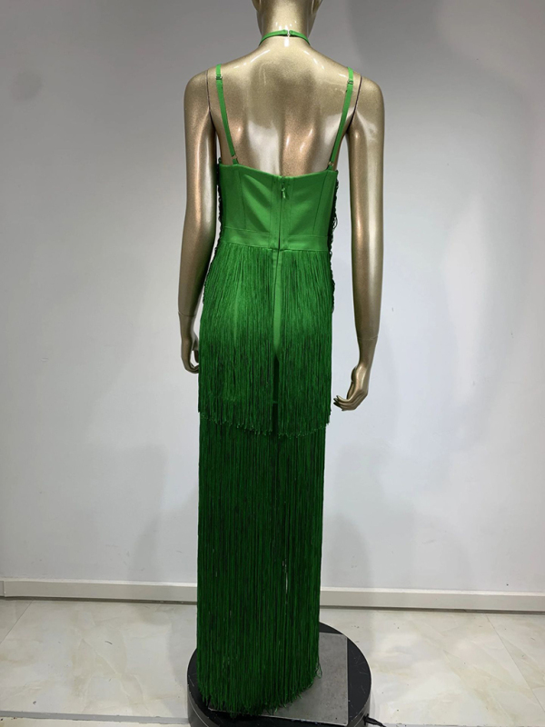New green halter neck maxi dress with fringe hem for dinner party Dress