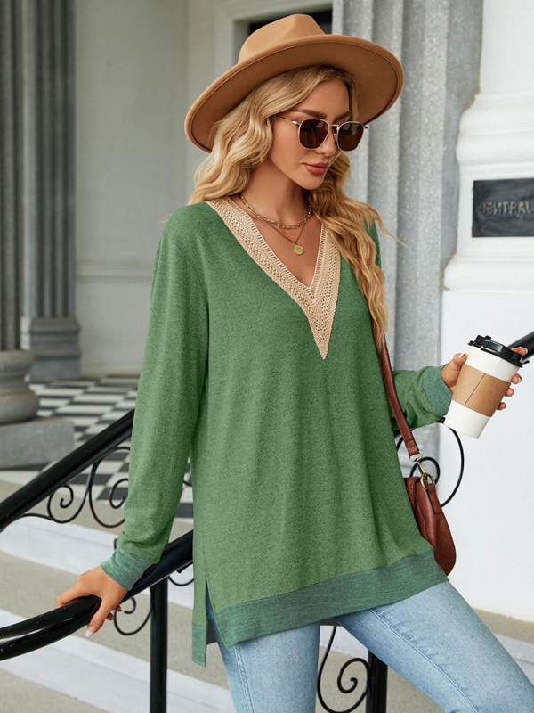The new lace V-neck contrast color slit loose long-sleeve T-shirt top is suitable for many occasions. The simple design makes the boring season colorful and interesting. A variety of collocation options make you confident and beautiful. Please use the size guide shown in our images. Please read each element in the size guide carefully before choosing a size. The size is measured manually, and it is normal for there to be an error of 1-3cm.