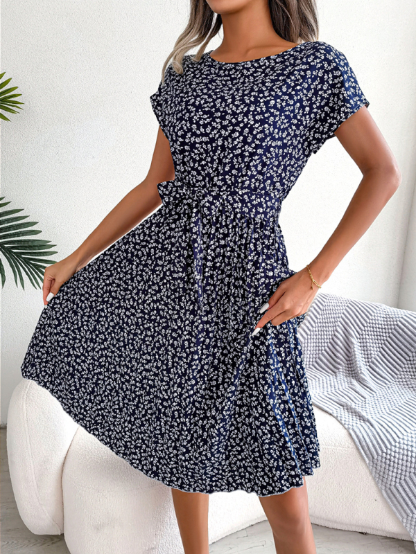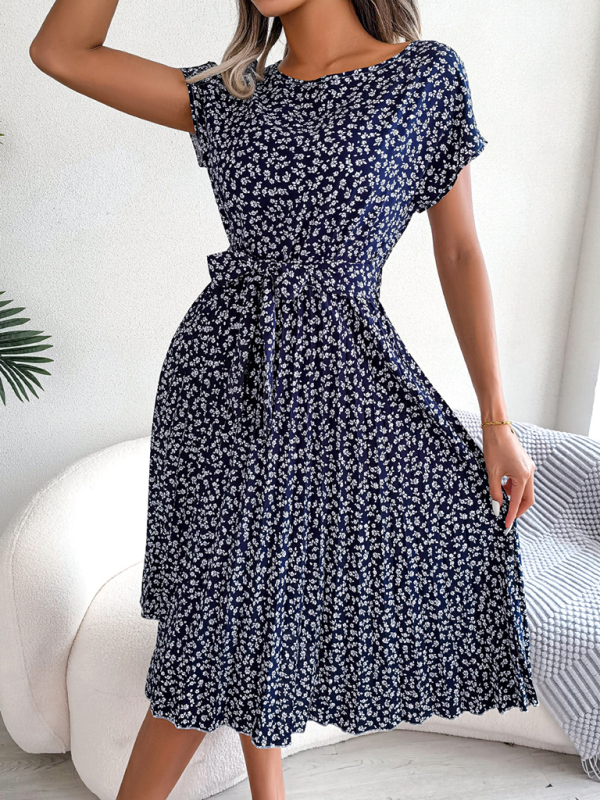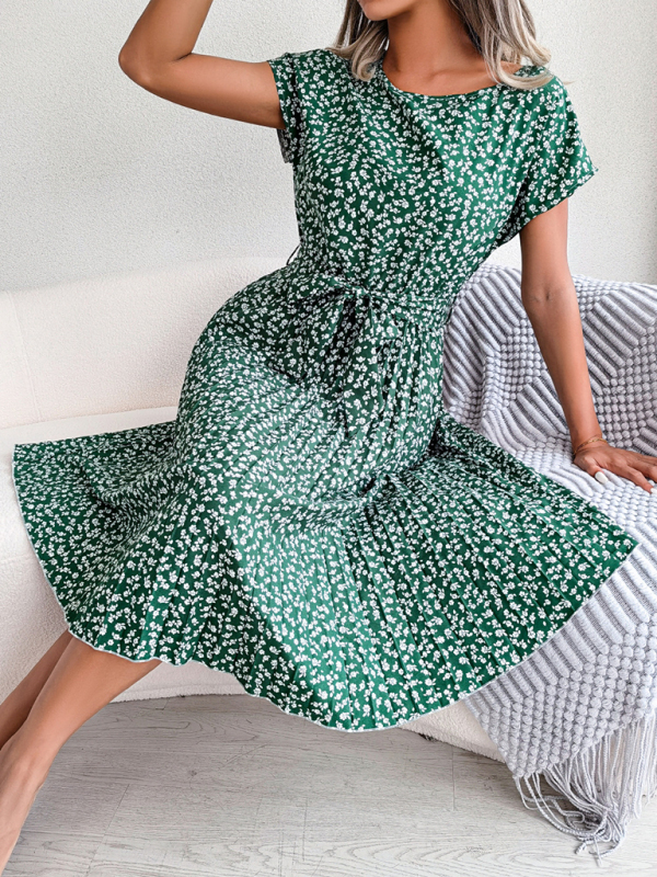 New women’s casual short-sleeved floral large hem pleated dress