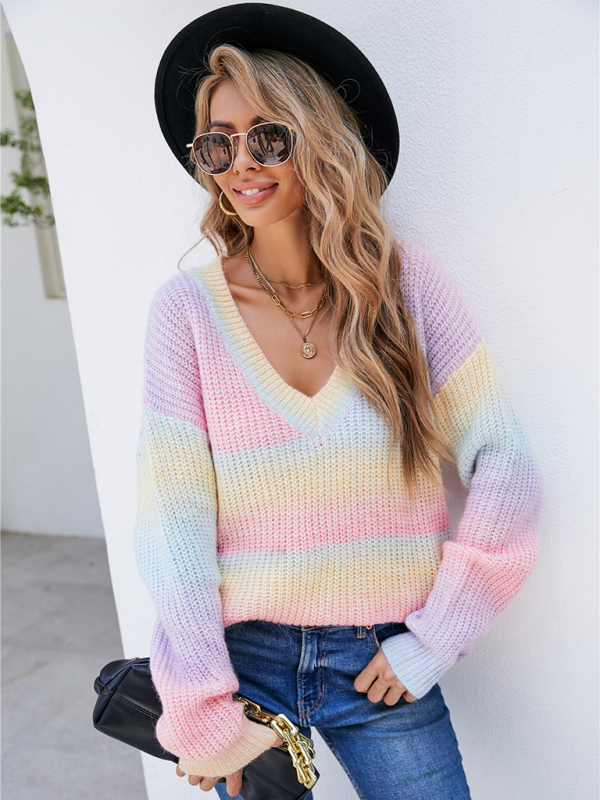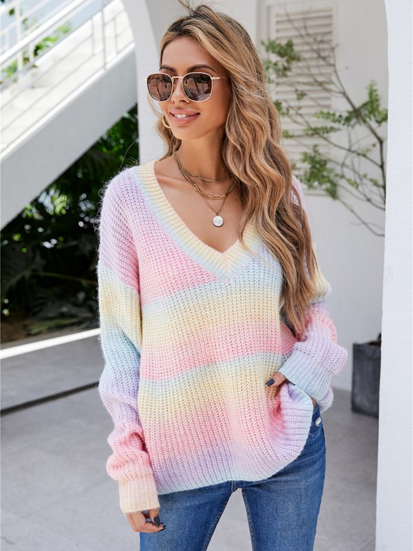 New Women’s Rainbow Stitching Tie-Dye V-Neck Pullover Sweater