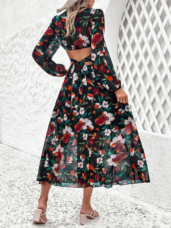 The dress adopts a V-neck ruffle design, showing a sexy and elegant neck line. The V-neck can lengthen the visual effect of the neck and highlight the curves of the upper body, adding a touch of romance and femininity to the overall look. The waist adopts a hollow design, showing a sense of fashion and unique visual effects, while also increasing the design sense of the overall shape.