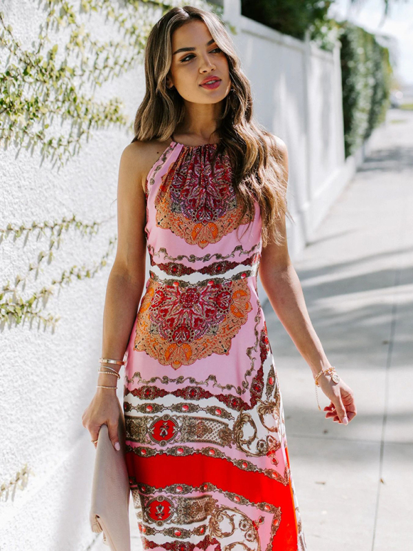 Printed Halter Neck High Waist Scheming Red Temperament Commuter Dress. Please use the size guide shown in our pictures. Before choosing a size, please read each element of the size guide carefully. Unique design, classic style, casual and comfortable. It is suitable for outing and leisure. The size is measured manually, and the error of 1-3cm is normal.