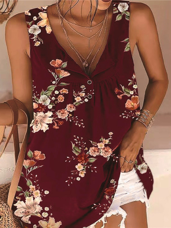 Printed V-Neck Buttons Sleeveless Tank Top Women’s T-Shirt