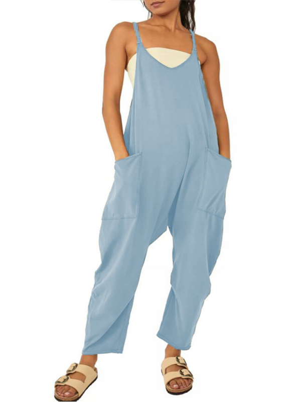 Women’s casual solid color V-neck suspender pocket jumpsuit with fashionable style and soft and comfortable fabric. It can be worn daily, going out, on vacation, etc. Washing method can be machine wash or hand wash. Fabric is wrinkle and pill resistant. The size is measured by hand, and it is normal for there to be an error of 1-3cm.