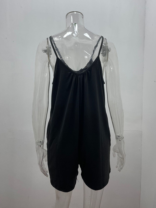 Women’s Casual Suspender Shorts Solid Color Round Neck Loose Pocket Jumpsuit