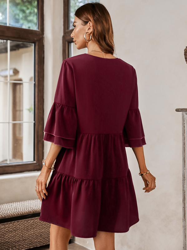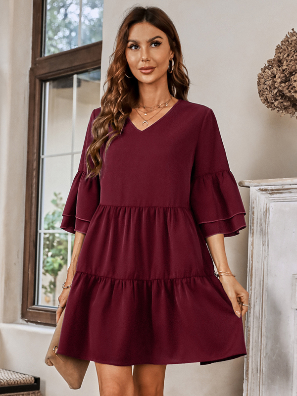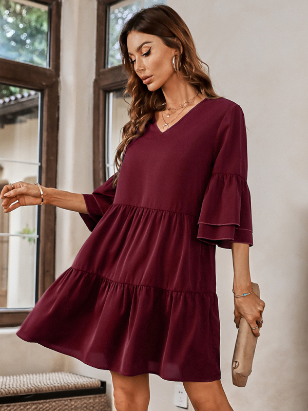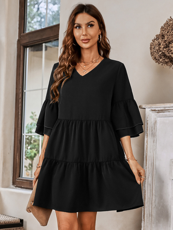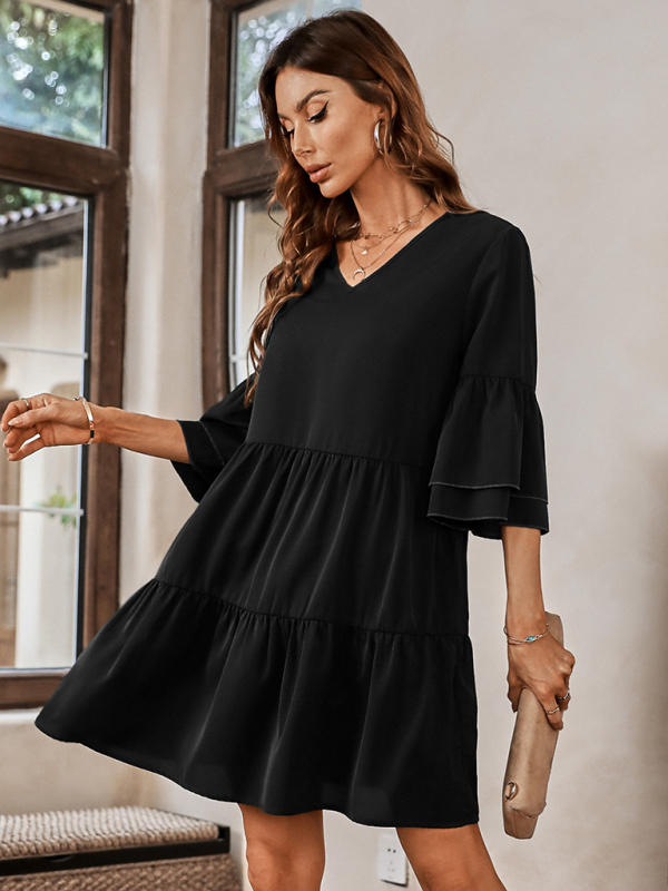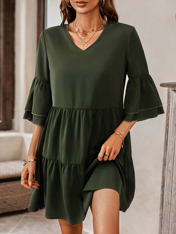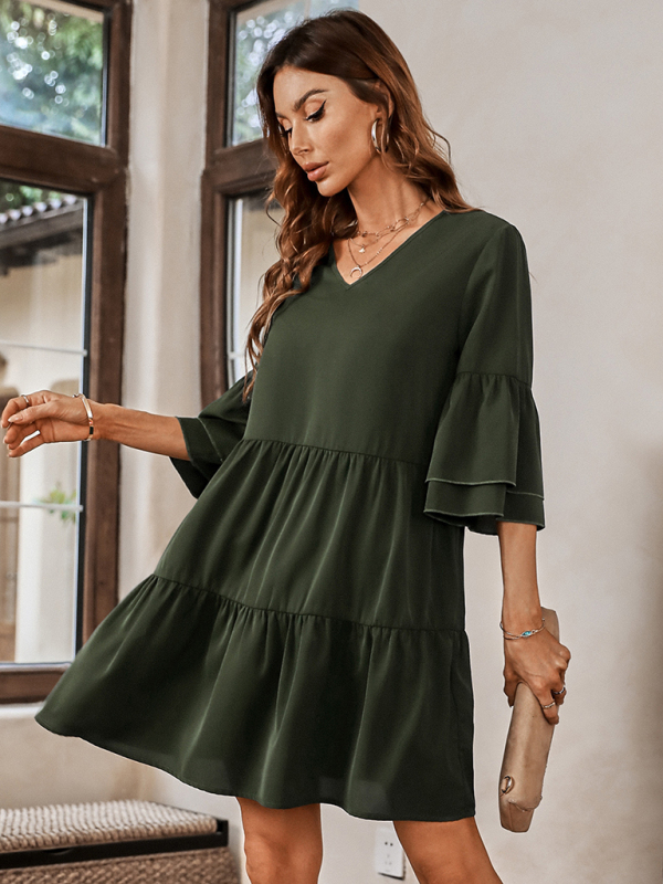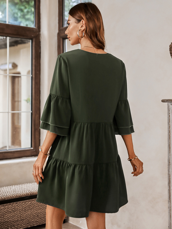 Women’s fashion V-neck solid color loose dress for women. Please use the size guide shown in our pictures. Before choosing a size, please read each element of the size guide carefully. Unique design, classic style, casual and comfortable. It is suitable for outing and leisure. The size is measured manually, and the error of 1-3cm is normal.
