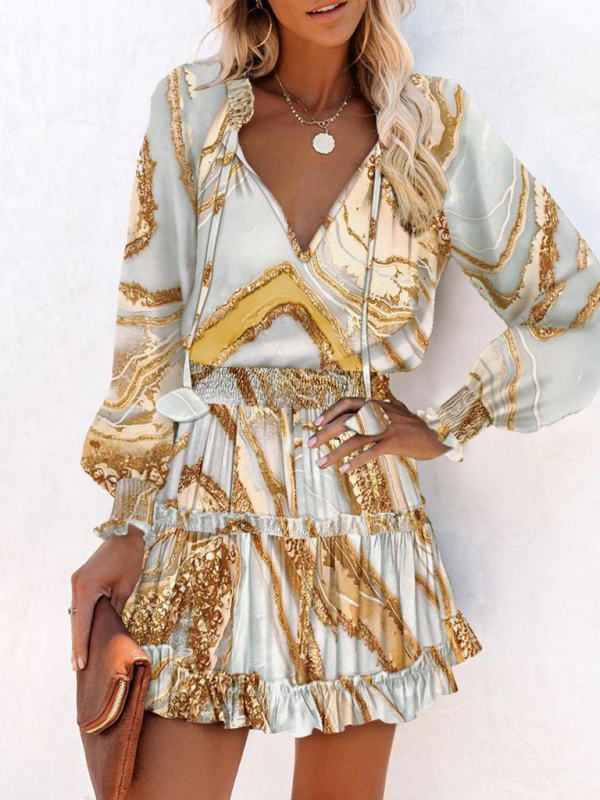 Women’s long-sleeved V-neck fashion print waist dress with fashionable style and soft and comfortable fabric. It can be worn for daily, dating, going out, vacation and so on. Washing method can be machine wash or hand wash. Fabric resists wrinkling and pilling. The size is measured by hand, and it is normal for there to be an error of 1-3cm.