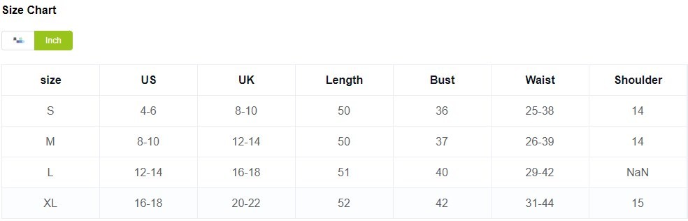 | Size | US | UK | Length | Bust | Waist | Shoulder |