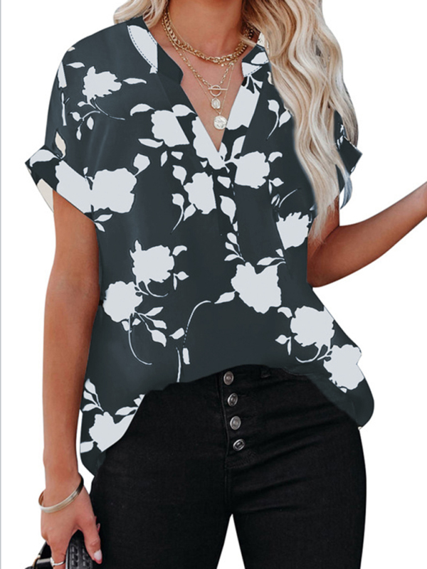 Women’s New Floral Print Casual V-Neck Short Sleeve Shirt
