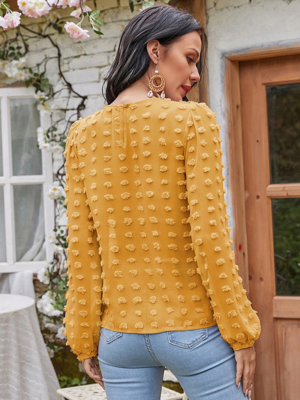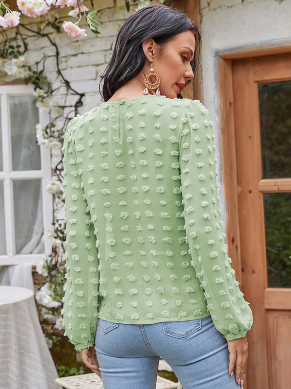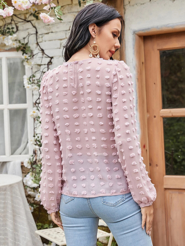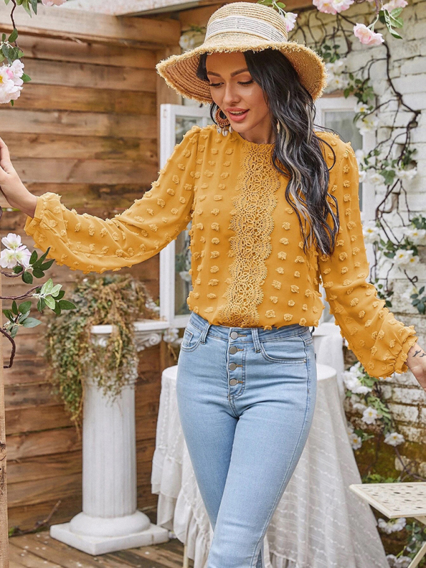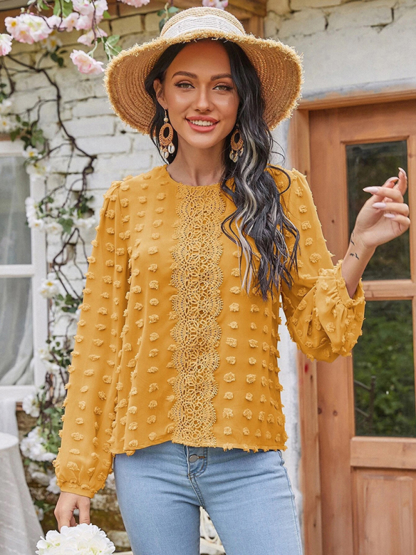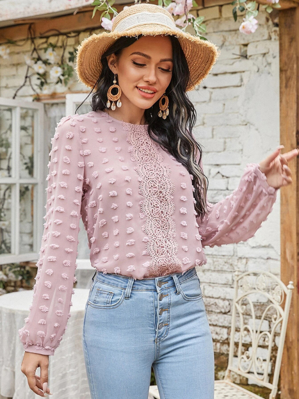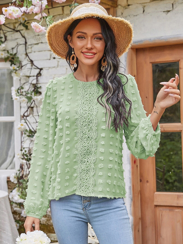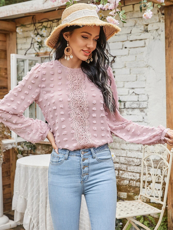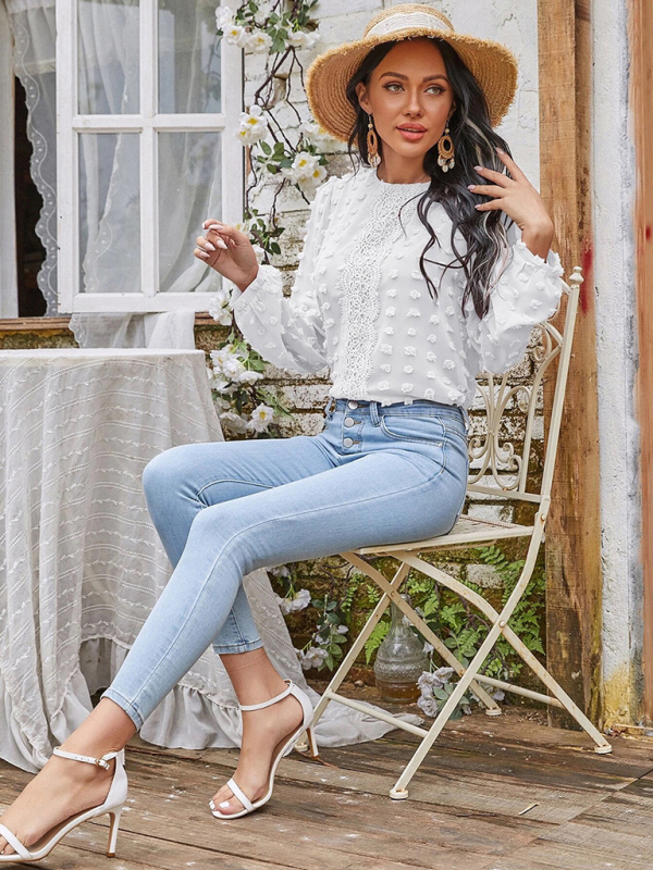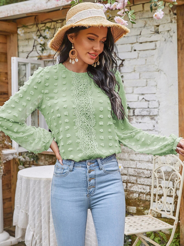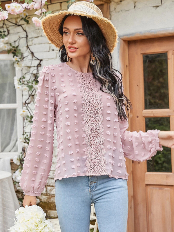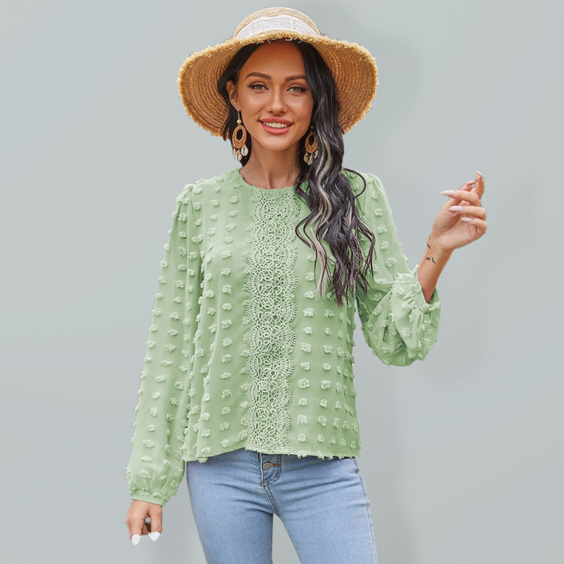 Women’s round neck balloon sleeve solid color lace shirt