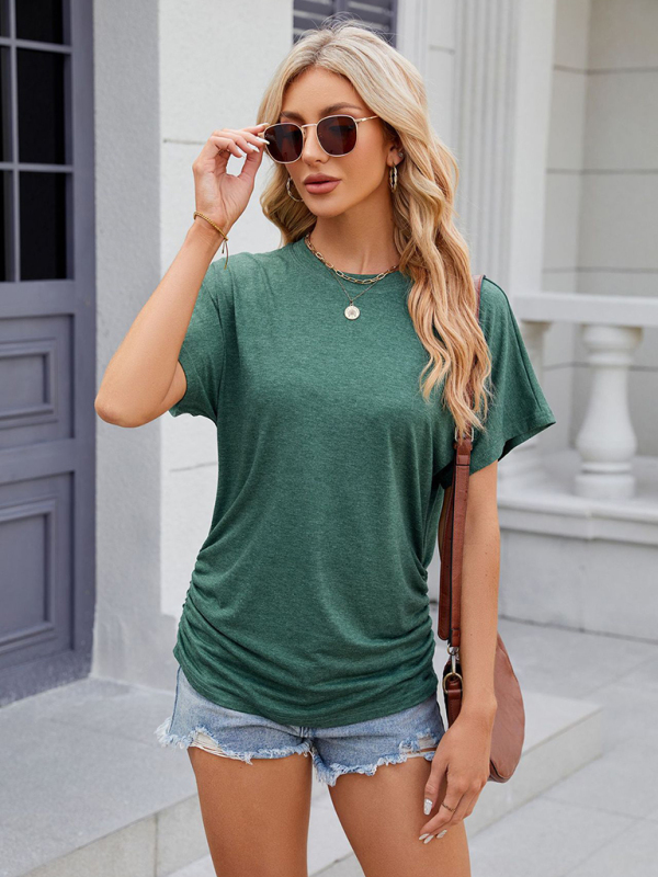 Women’s round neck pleated solid color short-sleeved loose T-shirt top. Please use the size guide shown in our pictures. Before choosing a size, please read each element of the size guide carefully. Unique design, classic style, casual and comfortable. It is suitable for outing and leisure. The size is measured manually, and the error of 1-3cm is normal.
