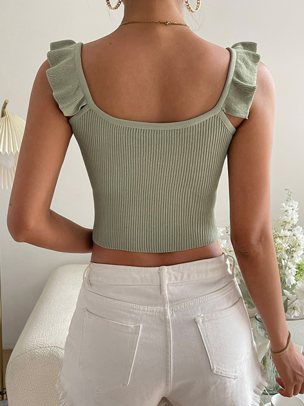 Women’s Ruffle trim cropped crop top with flying sleeves and navel cropping. It features a stylish style and a soft and comfortable fabric. It can be worn for daily, dating, going out, vacation and so on. Washing method can be machine wash or hand wash. Fabric resists wrinkling and pilling. The size is measured by hand, and it is normal for there to be an error of 1-3cm.