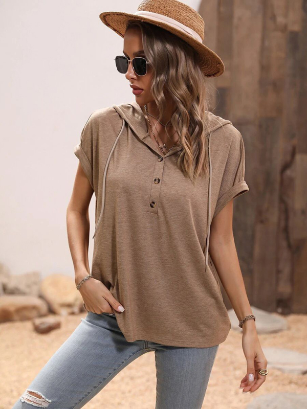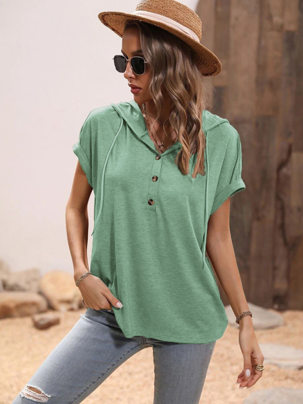 Women’sSolid color loose fit hooded button down short sleeve top featuring a stylish style and soft and comfortable fabric. It can be worn for daily, dating, going out, vacation and so on. Washing method can be machine wash or hand wash. Fabric resists wrinkling and pilling. The size is measured by hand, and it is normal for there to be an error of 1-3cm.