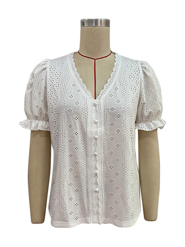Women’s solid color V-neck hollow short-sleeved top with fashionable style and soft and comfortable fabric. Whether it is daily, going out, vacation, work, etc., it can be worn by machine or hand. Fabric is wrinkle resistant and resistant to pilling. The size is measured by hand, and it is normal for there to be an error of 1-3cm.