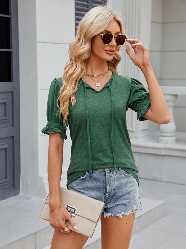 Women’s V-neck drawstring pleated solid color short-sleeved loose T-shirt . Please use the size guide shown in our pictures. Before choosing a size, please read each element of the size guide carefully. Unique design, classic style, casual and comfortable. It is suitable for outing and leisure. The size is measured manually, and the error of 1-3cm is normal.