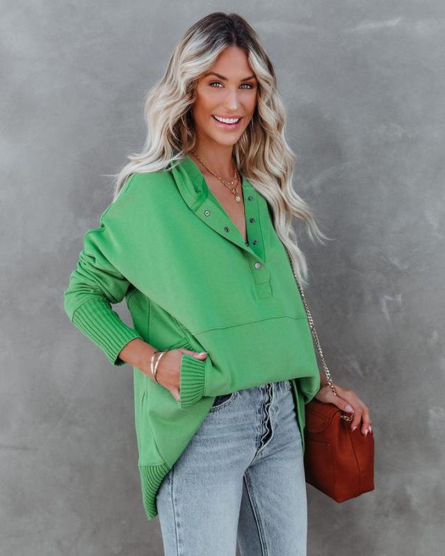 V-Neck bat sleeve sweatshirt offers a stylish, relaxed look.
